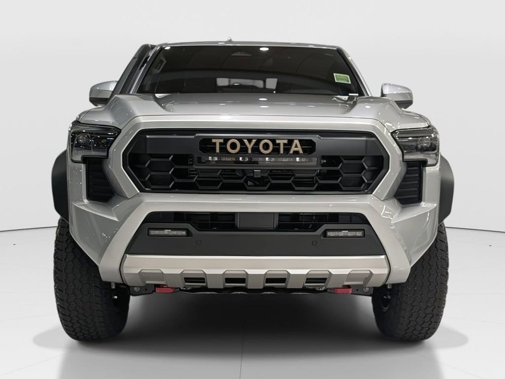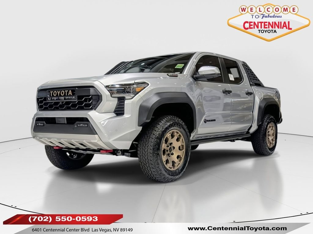 ** CALL (702) 527-3684 **Silver 2025 Toyota Tacoma Hybrid Trailhunter 4WD 8-Speed Automatic 2.4L I4 PDI Hybrid Turbocharged DOHC 16V3.583 Axle Ratio, 4-Wheel Disc Brakes, 9 Speakers, ABS brakes, Air Conditioning, Alloy wheels, AM/FM radio: SiriusXM, Anti-whiplash front head restraints, Apple CarPlay/Android Auto, Auto High-beam Headlights, Auto-dimming Rear-View mirror, Automatic temperature control, Black Tailgate Insert (TMS), Brake assist, Bumpers: body-color, Driver door bin, Driver vanity mirror, Dual front impact airbags, Dual front side impact airbags, Electronic Stability Control, Emergency communication system: Safety Connect (1-year trial), Exterior Parking Camera Rear, Four wheel independent suspension, Front anti-roll bar, Front Bucket Seats, Front Center Armrest, Front dual zone A/C, Front fog lights, Front reading lights, Fully automatic headlights, Garage door transmitter: HomeLink, Heads-Up Display, Heated & Ventilated Front Bucket Seats, Heated door mirrors, Heated front seats, Heated steering wheel, Illuminated entry, JBL Premium Audio, Knee airbag, Leather Shift Knob, Leather steering wheel, Low tire pressure warning, Mini-Tie Down (TMS), Navigation system: Drive Connect (1 year trial) includes Cloud Navigation with real time traffic and Google POI, Occupant sensing airbag, Outside temperature display, Overhead airbag, Overhead console, Panic alarm, Passenger door bin, Passenger vanity mirror, Phone Cables - Smart USB (TMS), Power door mirrors, Power driver seat, Power passenger seat, Power steering, Power windows, Radio: 14" Toyota Audio Multimedia, Rear anti-roll bar, Rear step bumper, Rear window defroster, Remote keyless entry, Security system, SofTex Seat Trim, Speed control, Speed-sensing steering, Split folding rear seat, Spray-On Bed Liner (TMS), Steering wheel mounted audio controls, Tachometer, Telescoping steering wheel, Tilt steering wheel, Traction control, Trip computer, Turn signal indicator mirrors, Variably intermittent wipers, Ventilated front seats, and Wheels: 18" Bronze-Finished Trailhunter Alloy.