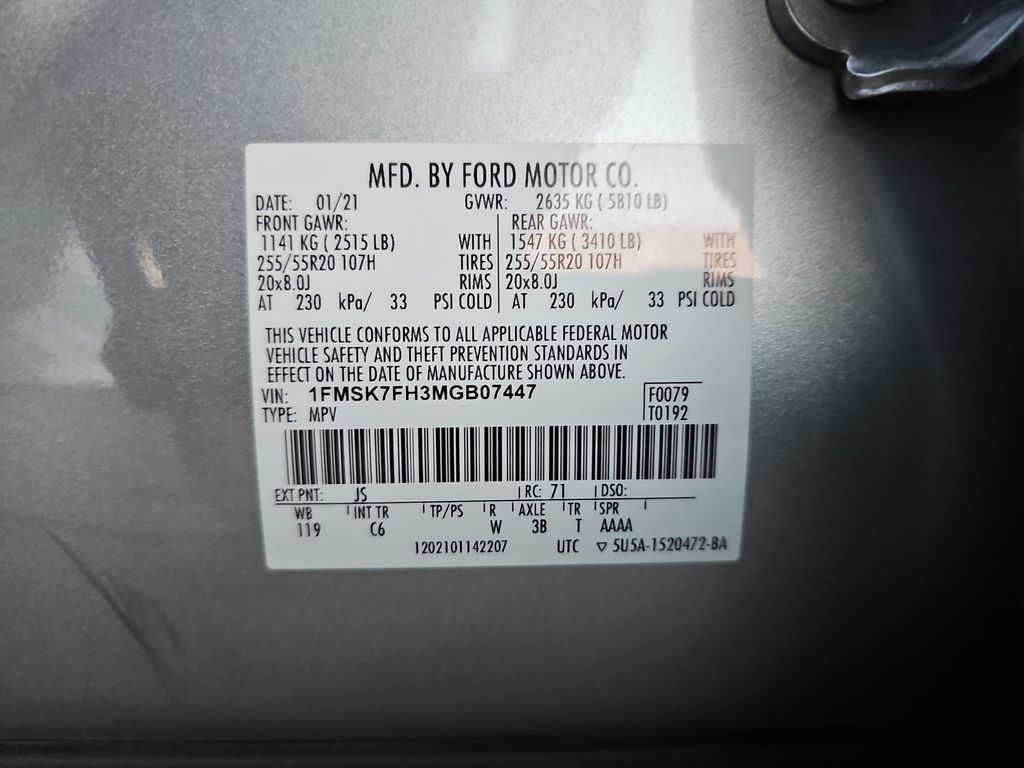 Limited, Navigation System, Premium Sound, Leather Seating, Power Seat, Heated and Ventilated Seats, Smart Key System, Blind Spot Monitor, 110V/150W AC Power Outlet, Premium B&O Audio with 12 Speakers, 20" Premium Aluminum Wheels, Auto High-beam Headlights, Auto-dimming Rear-View mirror, Automatic temperature control, Brake assist, Dual front impact airbags, Dual front side impact airbags, Electronic Stability Control, Emergency communication system: SYNC 3 911 Assist, Equipment Group 301A, Exterior Parking Camera Rear, FordPass Connect, Front dual zone A/C, Front fog lights, Fully automatic headlights, Heated front seats, Heated rear seats, Leather Heated/Ventilated Captain's Chairs, Leather steering wheel, Limited Convenience Package, Low tire pressure warning, Memory Driver's Seat, Navigation System, Occupant sensing airbag, Overhead airbag, Power Liftgate, Power Tilt/Telescoping Steering Column, Radio: B&O Sound System by Bang & Olufsen, Rain sensing wipers, Rear air conditioning, Remote keyless entry, Security system, Speed-sensing steering, Steering wheel mounted audio controls, SYNC 3 Communications & Entertainment System, SYNC 3/Apple CarPlay/Android Auto, Turn signal indicator mirrors, Ventilated front seats, Voice-Activated Touchscreen Navigation System.